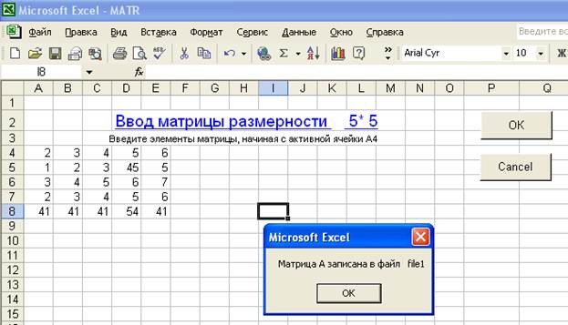 Создание кнопок ОК, ОТМЕНА, заполнение матрицы в файл, а
