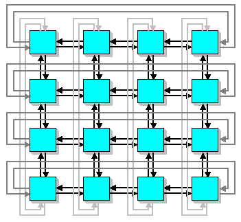 соединены однонаправленными каналами сети SCI в двумерный тор 3x4 и