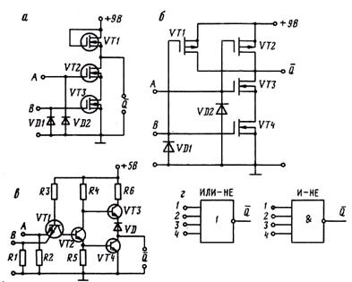 (б), комплиментарных парах МОП-транзисторов (в).