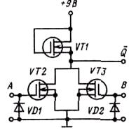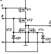 VT3 и VT4, имеющие n-каналы, оказываются запертыми и напряжение на выходе Q близко к напряжению источника питания, т. е. к напряжению