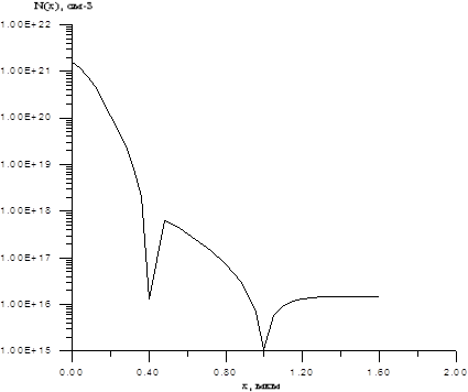 рассчитаны параметры биполярного транзистора. Профили распределения примесей в