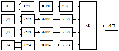 усилители, ФНЧ1…4 – фильтры нижних частот, УВХ1…4 – устройства выборки-хранения,