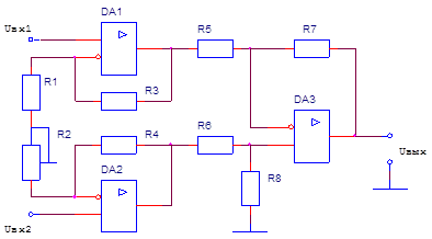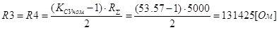 Расчет каскадов DA1 и DA2 начнем с выбора суммарного сопротивления резисторов R1 и R2. Примем его равным . Тогда номиналы резисторов R3 и R4 определим по формуле: