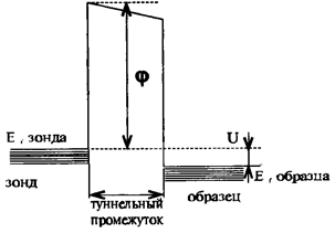 показана схема туннелирования электрона между образцом и зондом и приближении