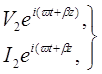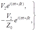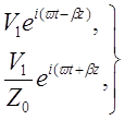 напряжение и ток волны, распространяющейся направо в координатной системе, а V2