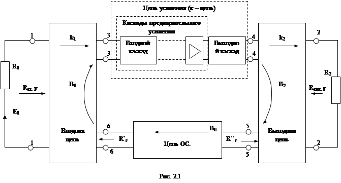 функциональные узлы усилителя (К – цепь, входную и выходную цепи, цепь ОС),