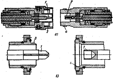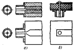 перпендикулярного коаксиально-полоскового перехода (рис. 17, б) осуществляют подбором диаметра соединительного штыря, проходящего через диэлектрическое