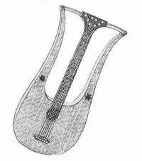 направлению к грифу) имеет плоскую нижнюю деку. Звук из жильных струн