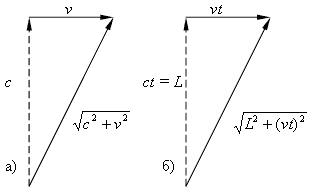 импульс света, равным √(L²–(vt)²) (рис.1). Тогда время t
